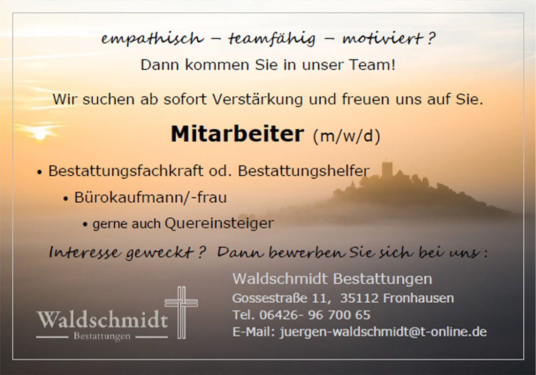 Für die Arbeit im Bestattungsunternehmen ist eine Ausbildung als Bestattungsfachkraft (Fach-)Geprüfter Bestatter oder Bestattermeister wünschenswert, aber kein Muss!